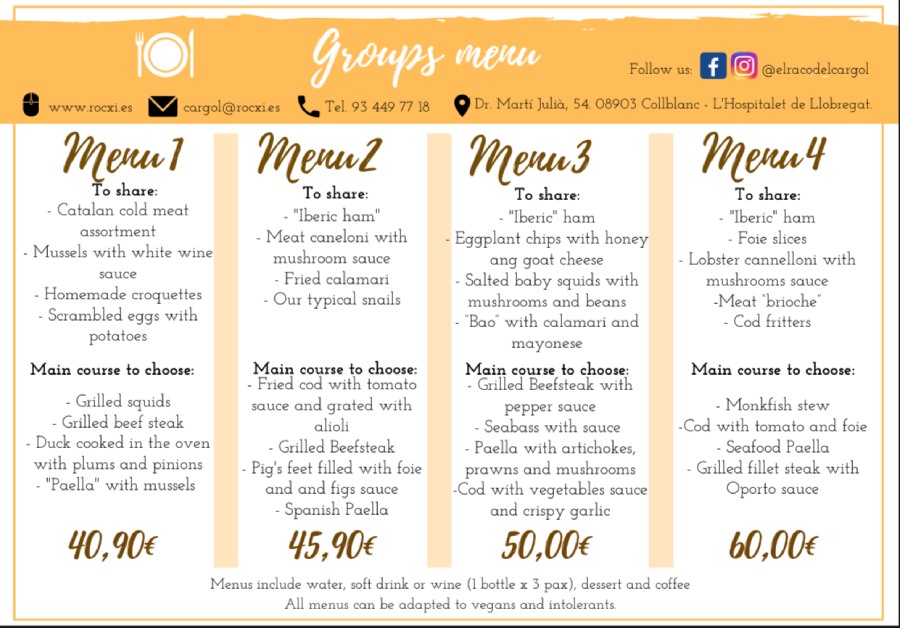 We offer lunch every Monday to Friday, with 4 first courses to choose from and 4 seconds, desserts, bread and drink included. In addition, we offer a tasting menu of 7 different dishes and desserts, each week. We also make menus for groups and companies.
